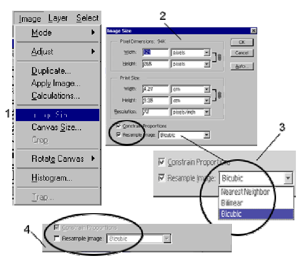 O tamanho e a resolução estão estreitamente relacionados no Photoshop, portanto esses dois atributos de imagem são controlados através da mesma caixa de diálogo. Você pode escolher o redimensionamento de uma imagem com ou sem alterar a sua resolução (resampling); se você permitir o resampling, a resolução da imagem não se altera e, se não permitir, a resolução da imagem aumenta ou diminui em proporção inversa ao tamanho da imagem. Evite aumentar uma imagem ou aumentar a sua resolução se possível. Para conseguir isso, o Photoshop precisa criar novos pixels na imagem e o software pode apenas tentar adivinhar quais as cores que os novos pixels devem ter. As imagens aumentadas frequentemente são borradas, com detalhes fora de foco.