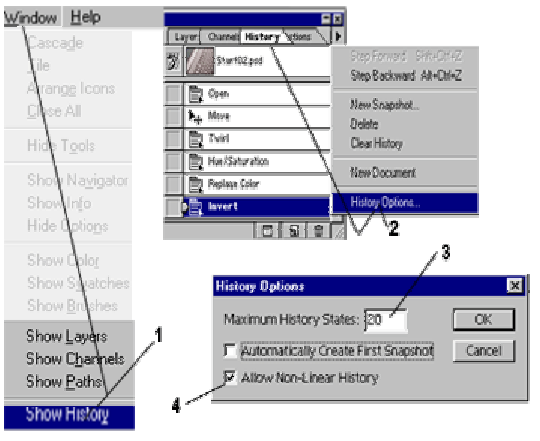 - Para excluir passos na palheta History sem afetar os passos adjacentes, dê um clique na opção Allow No-Linear History.