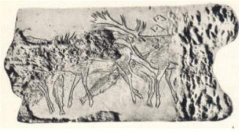 Figura 1 – Veados e Salmão, encontrada na região dos Altos Pirineus, Magdalenian, França, 9 5/8 ", Coleção do Musée des Antiquités, Saint-Germainen-Laye, França .