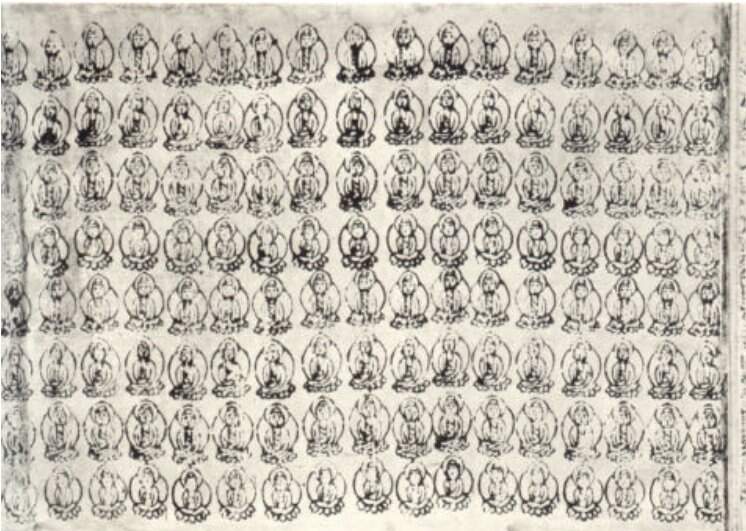 A imagem a seguir representa um desses exemplares, datado do Sc. VIII, que foi extraído do impresso Buda Sentado, da Gruta dos Mil Budas, Tun-huang, China.