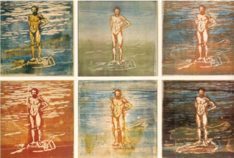 Figura 13 – Emiliano Di Cavalcanti, xilogravura a cores, 70 x 51 cm. Acervo do Banco Central do Brasil. Maria Bonomi nasceu na Itália em 1935, vindo para o Brasil ainda jovem. Ela fez estudos no Ateliê de Gravura do MAM (Museu de Are Moderna do Rio de Janeiro) e montou, juntamente com Lívio Abramo, o Estúdio de Gravura em São Paulo, em 1960. Ela inaugurou um novo estilo na xilogravura brasileira, utilizando impressões a cores com várias placas de madeira, cujas dimensões eram bastante avantajadas quando comparadas com aquelas encontradas nas gravuras de um modo geral. Ela criou gravuras com cerca de 80 a 100 cm de altura ou comprimento e, atualmente, cria painéis de grandes dimensões em madeira e demais materiais, que cobrem paredes e demais superfícies.Figura 14 – Maria Bonomi, Parede em Construção, xilogravura, 50 x 80 cm.Acervo do Banco do Brasil .