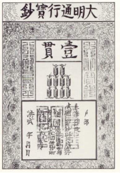 No Oriente isso aconteceu alguns séculos antes. No Sc. XIV, quando Marco Polo esteve na China, encontrou e relatou o uso disseminado do papel moeda28. A imagem a seguir apresenta uma dessas notas. O dinheiro de então era denominado Kwan e era o tempo da Dinastia Ming. No entanto, desde o Sc. VII, eram feitas oferendas aos mortos com papel moeda.No Ocidente, com o desenvolvimento de outras técnicas de impressão, dentre as quais a gravura em metal, a xilogravura foi perdendo espaço no que concerne à impressão de papel moeda, embora também tenha sido usada para essa finalidade.