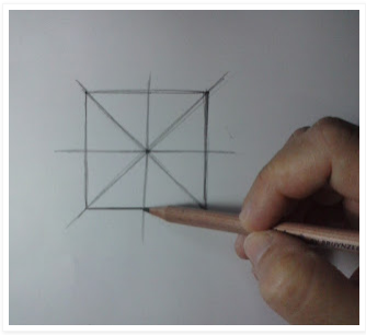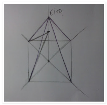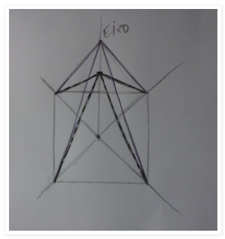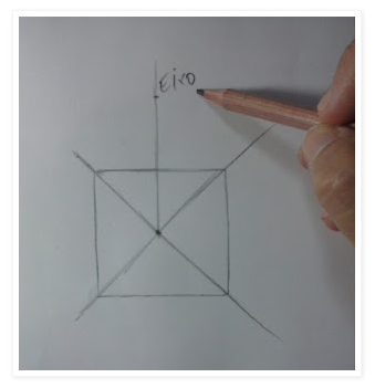 Voltando ao desenho do quadrado, vamos utiliza-lo como base para desenharmos uma pirâmide. Assim como no desenho da esfera, você deve traça diagonais e um eixo.