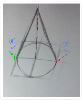 Mas, cuidado! É um erro muito comum, fazer a base de um cone ou um cilindro pontiagudo. Como mostra a figura as bases dessas figuras deve ser como no exemplo (A) e não o (B).