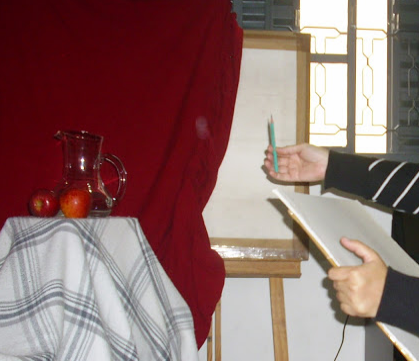 Ao invés de você iniciar seus estudos práticos usando foto de natureza morta, ou apenas fotos de alguns objetos ou frutas, tente fazer isso ao natural, ou seja posicione algum objeto de sua escolha a sua frente e com uma distancia de 2 metros ou mais. Feche um olho e estenda o braço e a mão que segura o lápis, ao nível dos olhos.