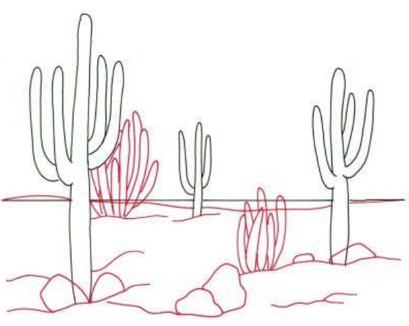 Etapa 2: esboce formas ovais e figuras irregulares similares para fazer as pedras e os rochedos. Use linhas onduladas para indicar os montes de areia. Desenhe mais dois cactos usando várias figuras ovais curvas e longas. Mude a linha reta do horizonte para outra levemente ondulada.