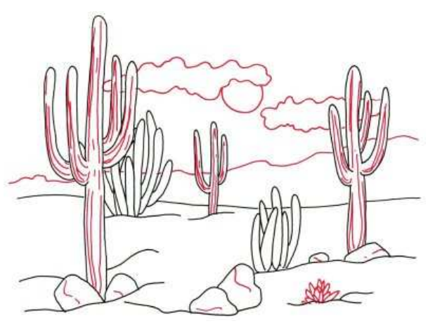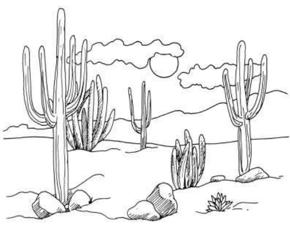 Cactos, rochas, areia e sol, essa paisagem de cactos no deserto tem de tudo. Aprimore suas habilidades de desenho aprendendo a fazer essa paisagem singular.