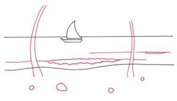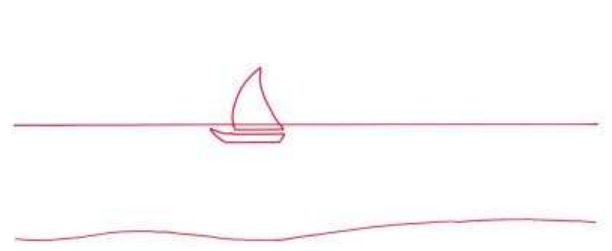 Etapa 1: faça uma leve linha do horizonte no meio da página. Desenhe o casco do veleiro com um retângulo comprido com um lado pontiagudo virado para cima, ou para a proa. Faça a vela usando um triângulo com dois lados curvos e a parte de baixo achatada. Desenhe outra linha ligeiramente curva abaixo do barco para representar o contorno da costa.