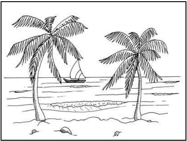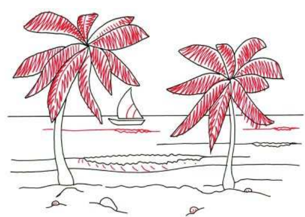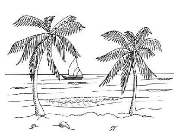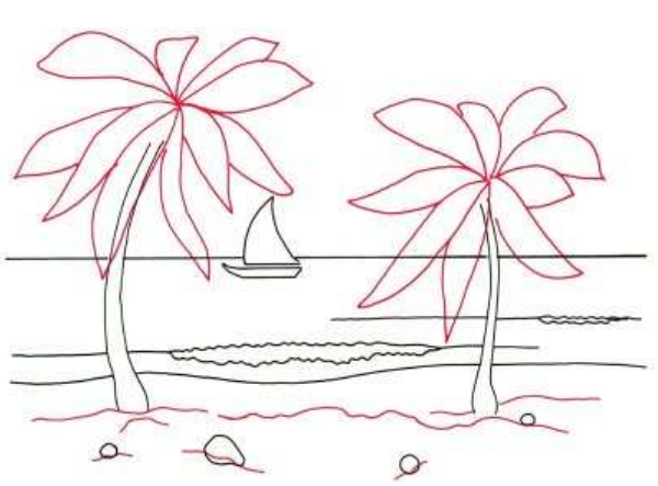 Etapa 4: dê forma às folhas das palmeiras, usando linhas tracejadas longas, como mostrado na ilustração. Use um par de linhas curvas para fazer as listras da vela do barco (em inglês). Esboce mais algumas ondas na superfície do mar. Coloque linhas curtas na frente da primeira onda. Acrescente linhas curtas nos cocos.