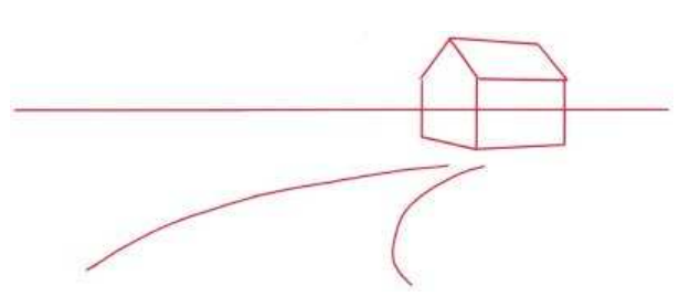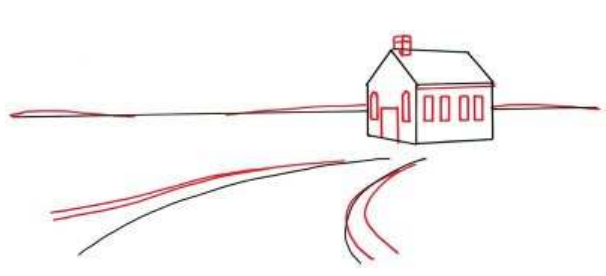 Etapa 1: esboce uma leve linha reta para o horizonte. Posicione aproximadamente no meio da sua área de desenho. Faça um retângulo fechado para criar o lado mais longo da igreja. Acrescente um retângulo com três lados, aberto no topo para formar a fachada. Desenhe todas as linhas verticais paralelas. Use um retângulo inclinado para o lado visível do telhado. Junte a parte superior do telhado ao topo da linha inclinada à esquerda para completar o contorno. Esboce o começo da estrada com duas linhas curvas que se juntam próximo à lateral da igreja.