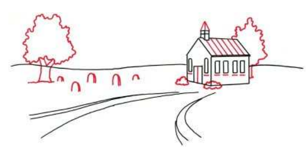 Essa igreja rural está no final de um caminho de pedras cercada por belas árvores. Você vai se divertir aprendendo a desenhar todos os componentes dessa charmosa paisagem.