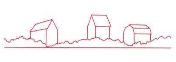 Etapa 1: esboce uma linha horizontal um pouco abaixo do meio da folha. Desenhe a primeira linha da árvore um pouco acima da linha horizontal, usando uma linha distorcida contínua. Para cada construção, use uma régua para fazer três linhas retas verticais paralelas. Para as duas construções da esquerda, junte duas das linhas com uma figura em V invertida. Em seguida, desenhe o telhado com um retângulo inclinado. Para o celeiro à direita, junte duas das linhas verticais com duas linhas inclinadas como mostrado na ilustração. Use dois retângulos inclinados para o telhado.