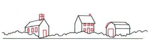 Etapa 2: continue a acrescentar janelas e portas às construções com quadrados e retângulos pequenos. As linhas verticais devem ser paralelas. Comece desenhando uma torre de igreja na construção à esquerda com duas figuras em forma de caixa com dois lados. Acrescente um quadrado pequeno à casa do meio para criar uma chaminé. Desenhe uma segunda linha perto da linha do telhado do celeiro para dar profundidade.