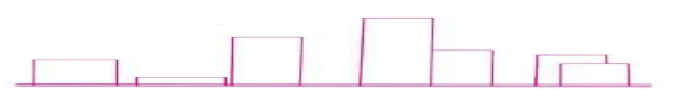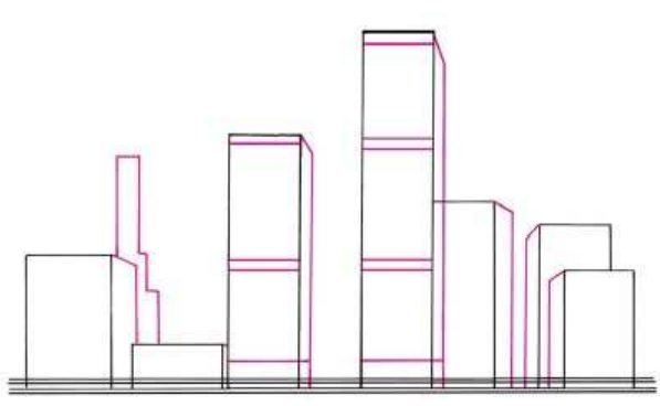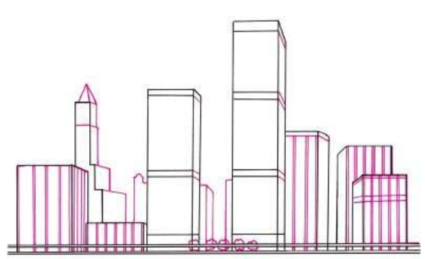 Etapa 1: esboce quatro linhas horizontais abaixo do centro da área de desenho. Utilizando uma régua, adicione vários retângulos de diferentes tamanhos, como mostrado na ilustração, sobrepondo alguns deles. Essas figuras serão as fachadas dos prédios. Todas as linhas verticais devem estar paralelas.