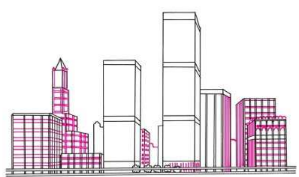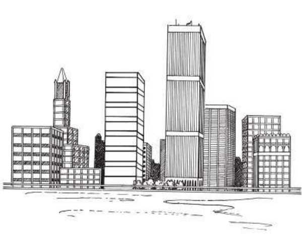 As cidades possuem paisagens incríveis como essa deslumbrante vista de prédios e edifícios. Essa paisagem é um grande projeto de desenho para os amantes da cidade e do campo.