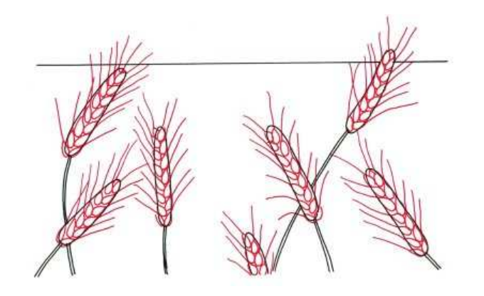 Etapa 2: desenhe figuras ovais pequenas com extremidades pontiagudas dentro do contorno dos talos de trigo para fazer as sementes. Use uma combinação de linhas retas e quebradas para desenhar uma fibra comprida e fina na ponta de cada semente.