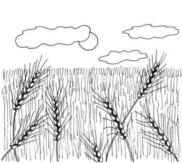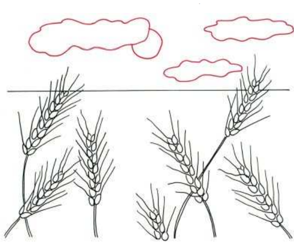 Etapa 3: acrescente um sol aproximadamente na metade do céu, entre as pontas mais altas dos trigos. Crie nuvens ao redor do sol com figuras ovais irregulares.
