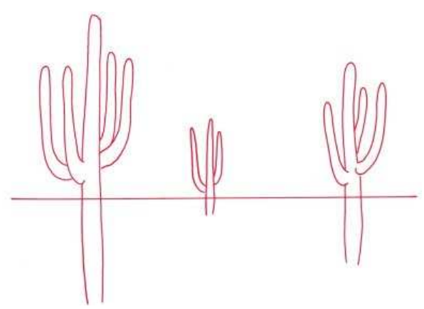Etapa 1: faça uma linha no meio da página para criar o horizonte. À esquerda, desenhe um tronco comprido em formato de lápis para fazer um cacto. Acrecente quatro galhos curvados para cima, um pouco mais estreitos. Em seguida, esboce mais dois cactos, um ao longe e outro entre o cacto que está mais perto e o outro mais distante.