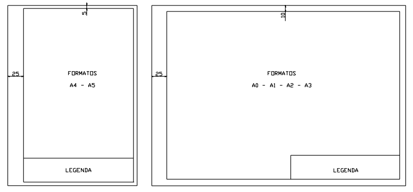 Nas dimensões das folhas deve haver um excesso de papel de 10 mm nos quatro lados e as margens ficam limitadas pelo contorno externo da folha e pelo quadro. O quadro tem a finalidade de limitar o espaço para o desenho conforme figura abaixo.