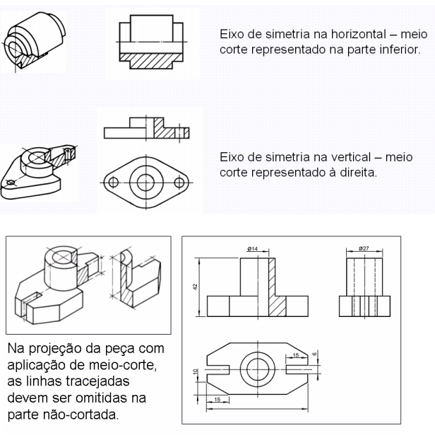 O meio-corte é empregado no desenho de peças simétricas no qual aparece somente meia-vista em corte. O meio-corte apresenta a vantagem de indicar, em uma só vista, as partes interna e externa da peça.