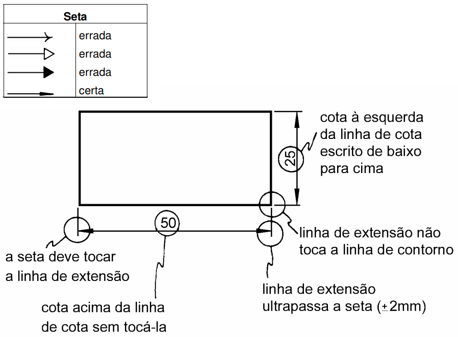Observação: As cotas devem ser colocadas de modo que o desenho seja lido da esquerda para direita e de cima pra baixo, paralelamente à dimensão cotada. Sempre que é possível é bom evitar colocar cotas em linhas tracejadas.