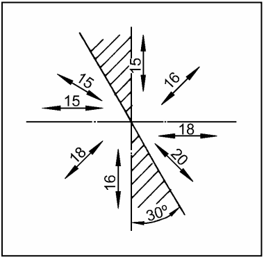Porém, é preciso evitar a disposição das linhas de cota entre os setores hachurados e inclinados de cerca de 30°.