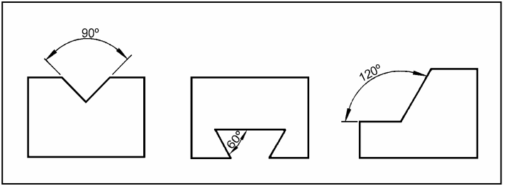 Existem peças que têm elementos angulares. Elementos angulares são formados por ângulos. O ângulo é medido com o goniômetro pela sua abertura em graus. O goniômetro é conhecido como transferidor. A cotagem da abertura do elemento é feita em linha de cota curva, cujo centro é vértice do ângulo cotado.
