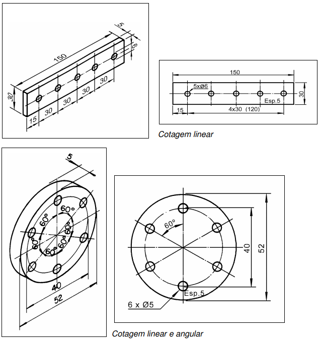 Existem peças com furos que têm a mesma distância entre seus centros, isto é, furos espaçados igualmente. A cotagem da distância entre centros de furos pode ser feita por cotas lineares e por cotas angulares.