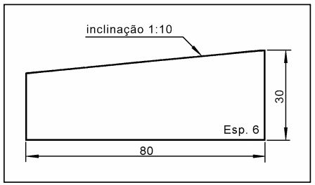 A relação de inclinação 1:10 indica que a cada 10 milímetros do comprimento da peça, diminui-se um milímetro da altura. Como a relação de inclinação vem indicada no desenho técnico, não é necessário que a outra cota de altura da peça apareça.