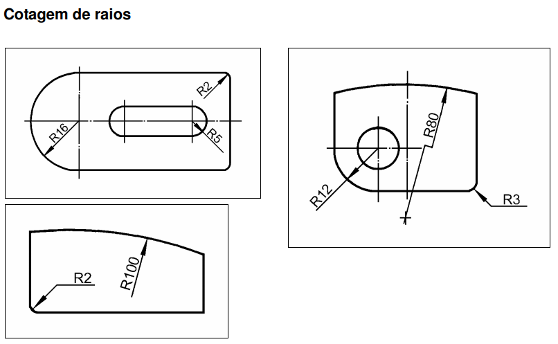 O raio deve ser indicado com o símbolo R sem cota quanto o seu tamanho for definido por outras cotas.