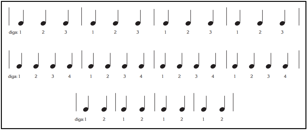 Contar o tempo corretamente o ajudará a melhor interpretar o ritmo. Conte o tempo em cada um dos compassos abaixo, voltando novamente ao um após cada travessão.
