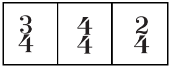 Pode-se escrever música com qualquer número de tempos por compasso. A maior parte dos hinos e músicas para crianças têm três tempos (ou três batidas) por compasso, como demonstrado acima ou quatro tempos, dois tempos ou seis tempos por compasso como demonstrado abaixo.