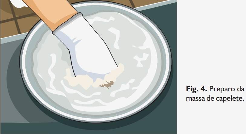 A seguir, são listados os ingredientes usados no preparo da massa de capelete. Para facilitar o cálculo da receita, tome como referência esta formulação, que se baseou em 1 kg de farinha de trigo. Ingredientes • 1 kg de farinha de trigo • 6 ovos • 1 colher (de sopa) de óleo • 20 colheres (de sopa) de água