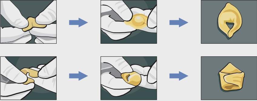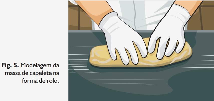 Deixar pequena sobra de massa nas bordas, para facilitar o fechamento do capelete. Fechar o capelete comprimindo suas bordas firmemente, com os dedos. O capelete pode ser modelado em dois formatos principais, conforme se vê na Fig. 12. Para obter o primeiro formato, segurar o capelete com uma das mãos e, com a outra, enrolar o lado maior do triângulo até que as duas extremidades se toquem. Para obter o segundo formato, comprimir bem as extremidades, mantendo as pontas do triângulo para cima.