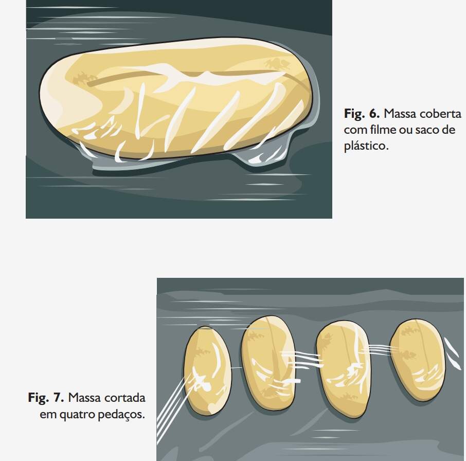 Colocar os ingredientes numa bacia de aço inoxidável ou de plástico, misturar bem e amassar manualmente até obter uma massa mais ou menos lisa. Se desejar, pode-se usar a amassadeira ou o cilindro (Fig. 4). Modelar a massa na forma de um rolo (Fig. 5). Colocar sobre a massa um saco ou um filme de plástico próprio para alimentos, para evitar que sua superfície resseque (Fig. 6). Cortar a massa em quatro pequenos pedaços de igual tamanho (Fig.7).