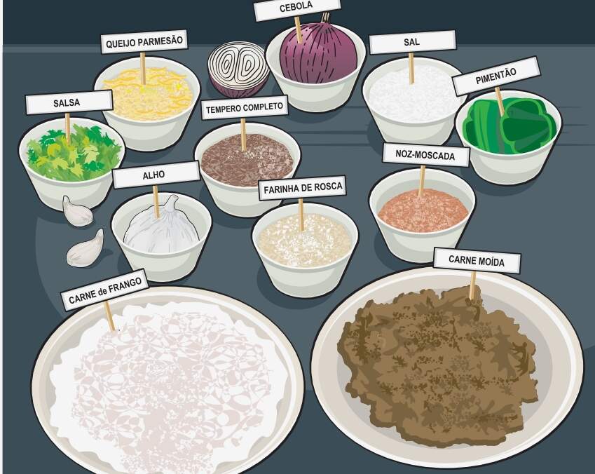 • 250 g de carne de frango • ¼ de uma cebola média • ¼ de um pimentão • ¼ de um maço de salsa • 1 dente de alho (ou tempero completo) • Sal a gosto (ou tempero completo) • ¾ de um copo de farinha de rosca • ½ colher de chá de noz-moscada • 50 g de queijo parmesão ralado (opcional) • 1 ovo (opcional)