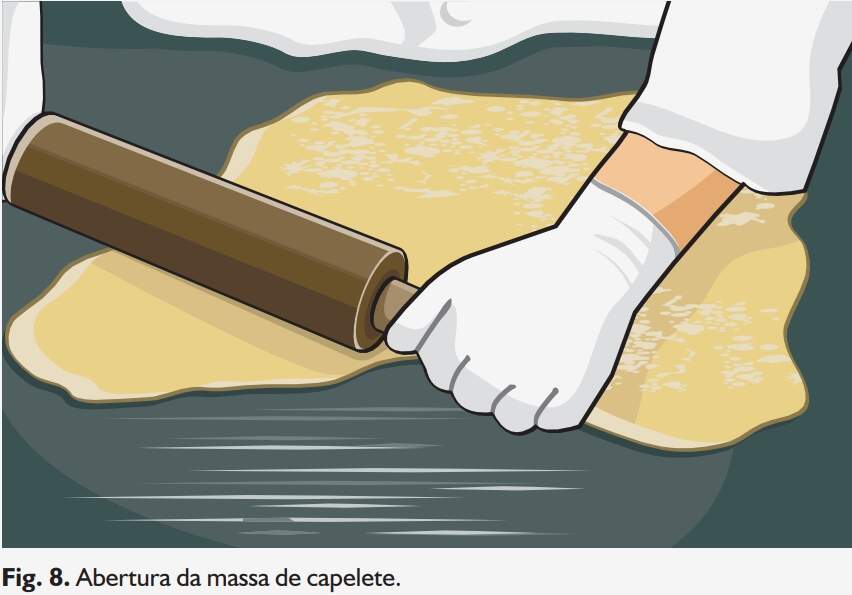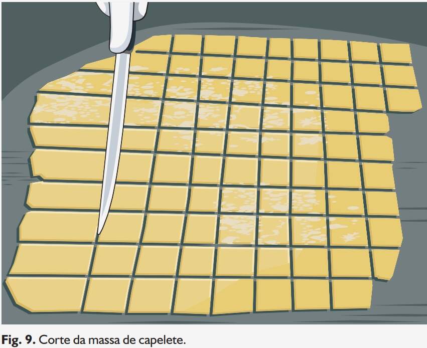 Polvilhar a mesa com farinha de trigo e abrir cada pedaço de massa com um rolo de macarrão ou cilindro, até atingir a espessura de mais ou menos 0,3 cm (Fig. 8). Com uma carretilha ou com faca afiada, cortar a massa em quadrados de 3 cm de lado (Fig. 9).