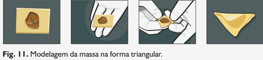 Dobrar o quadrado de massa contendo o recheio na diagonal, formando um triângulo (Fig. 11).