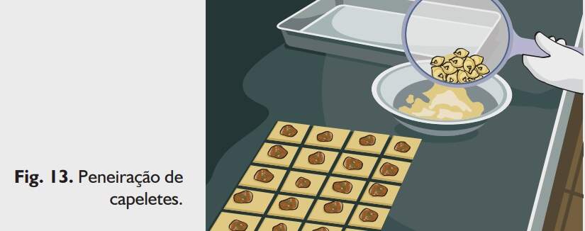 Colocar os capeletes em uma bacia contendo farinha de milho. Misturar os capeletes com a farinha, para que não grudem uns nos outros. Em seguida, peneirar os capeletes para retirar o excesso de farinha (Fig. 13).