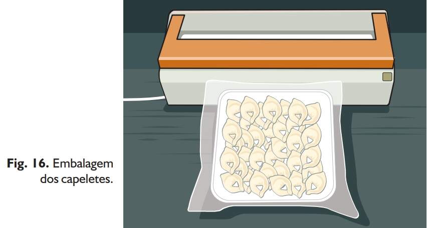 Depois de congelados, colocar os capeletes em sacos de plástico próprios para alimentos ou em bandejas de isopor (Fig. 16) e mantê-los em freezer até serem consumidos ou comercializados. Ao embalar os capeletes, retirar todo o ar, usando bomba de vácuo para congelamento.