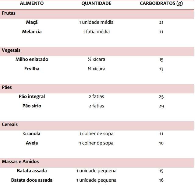 Confira a seguir uma tabela com algumas fontes de carboidratos e a quantidade média presente em cada um. Essa tabela pode servir de base para que você possa organizar suas refeições e fazer um cálculo aproximado de quantos gramas de carboidratos você está consumindo durante o dia.