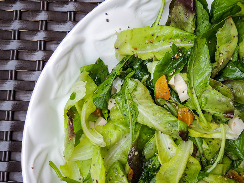 Lave bem as folhas e misture numa saladeira bonita. Misture também os damascos picados, a chia, o gergelim e o palmito e tempere a gosto. Não tem tempero melhor pra salada do que sal, azeite e limão.