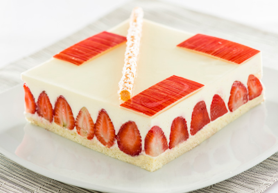 Dividir o Pão-de-Ló em duas partes e reservar. Retirar o papel manteiga do Finger Sponge e colocar na lateral de um aro 18 cm. Colocar o Pão-de-Ló no fundo do aro, umedecer com Calda Dulcerío 3 Leches e aplicar a mousse. Levar para gelar por 60 min em geladeira. Decorar com frutas e pincelar Harmony Cold Neutro conforme a foto.