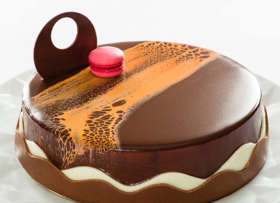 Cobrir com plástico filme um aro de 18 cm. Colocar parte da mousse no fundo e nas laterais, adicionar o palet outra parte da mousse e finalizar com o Satin. Levar para o congelador por aproximadamente 30 min. Aquecer a glaçagem à 35°C e aplicar sobre a torta. Abrir a pasta de chocolate branco e a pasta de chocolate meio amargo em plásticos separados, cortar as massas de chocolate em formato ondulado, e aplicar na lateral da torta conforme a foto.
