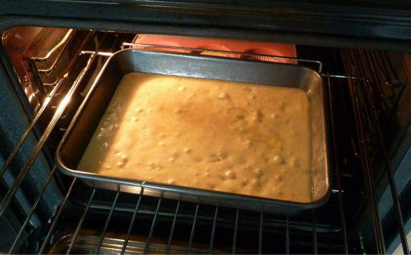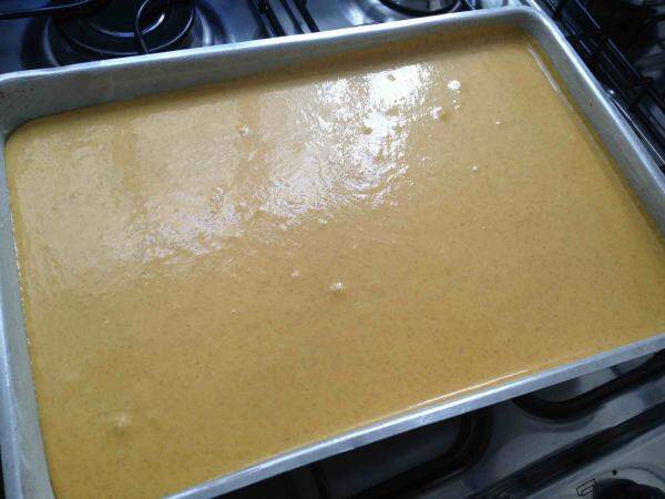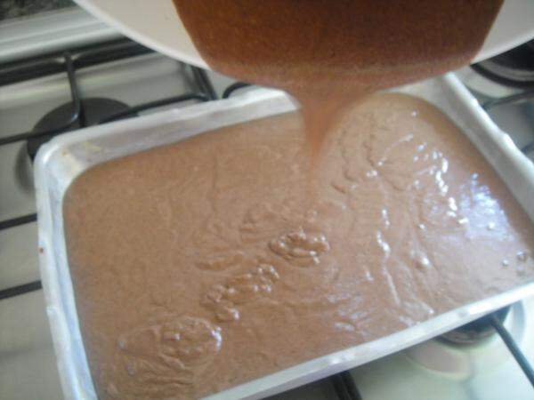 3 - Por fim incorpore o fermento, e verta esta massa numa assadeira retangular, devidamente untada e enfarinhada. Leve a assar no forno preaquecido a 160ºC por 30 minutos, ou até passar no teste do palito.