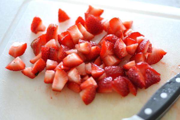 5 - Entretanto prepare o recheio fácil de bolo de pote: lave e corte os moranguinhos em pedaços ou em rodelas, e misture o leite com o leite condensado, para obter uma calda menos espessa.