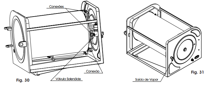 Existem dois orifícios localizados na parede posterior da câmara (Fig. 8) que servem como conduto para o vapor até a válvula solenoide. Devem ser inspecionadas diariamente e permanecer livre de obstruções.