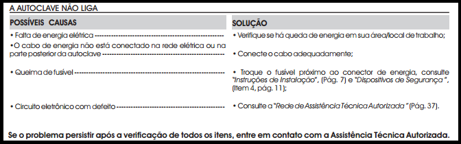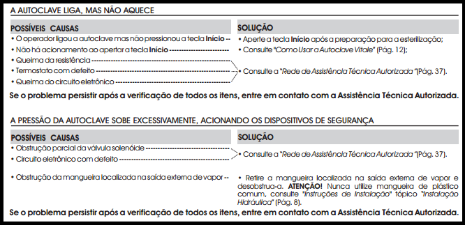 Verifique as possíveis causas, tome as providências necessárias para corrigir o problema e efetue um novo ciclo para o reprocessamento dos materiais de acordo com as instruções em “Como Usar a Autoclave Vitale” (Pág. 12). Antes de iniciar o novo ciclo, o operador deverá verificar se houve sobra de água na câmara, que deverá ser retirada manualmente através da porta com o uso de um pano limpo e seco que não solte fiapos. Atenção! Para sua segurança, lembre-se de usar EPI (ex: luvas de látex apropriadas). Aguarde entre 15 e 20 minutos para o resfriamento da câmara antes de iniciar um novo ciclo;