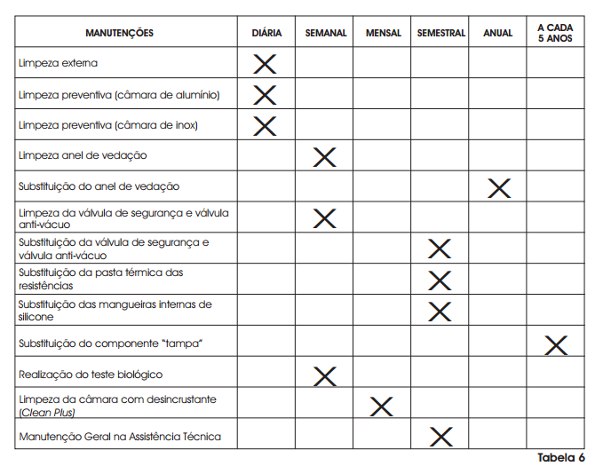 Para o melhor funcionamento e durabilidade da sua autoclave são necessários alguns procedimentos. A manutenção preventiva corresponde à realização de todos os procedimentos abaixo relacionados: