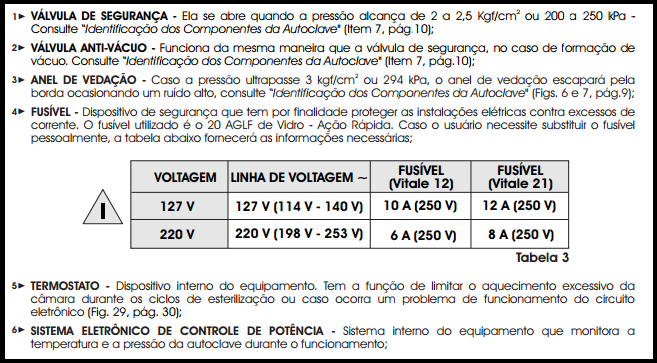Para que a autoclave tenha um bom funcionamento, a voltagem da rede elétrica deverá ser estável, ou seja, sem oscilações. Acione um técnico eletricista e verifique se a sua instalação elétrica está de acordo com as especificações necessárias. É obrigatória a utilização de um disjuntor exclusivo para a tomada onde a autoclave será conectada. Se mesmo após todas as especificações seguidas, a rede elétrica se apresentar oscilante, entre em contato com sua concessionária e solicite a adequação (Resolução nº 505 de 26/11/2001 - ANEEL (Agência Nacional de Energia Elétrica) - Art. 2º Incisos IV, V, VI e VII - Art. 6º Incisos I, II e III - Art. 16º).